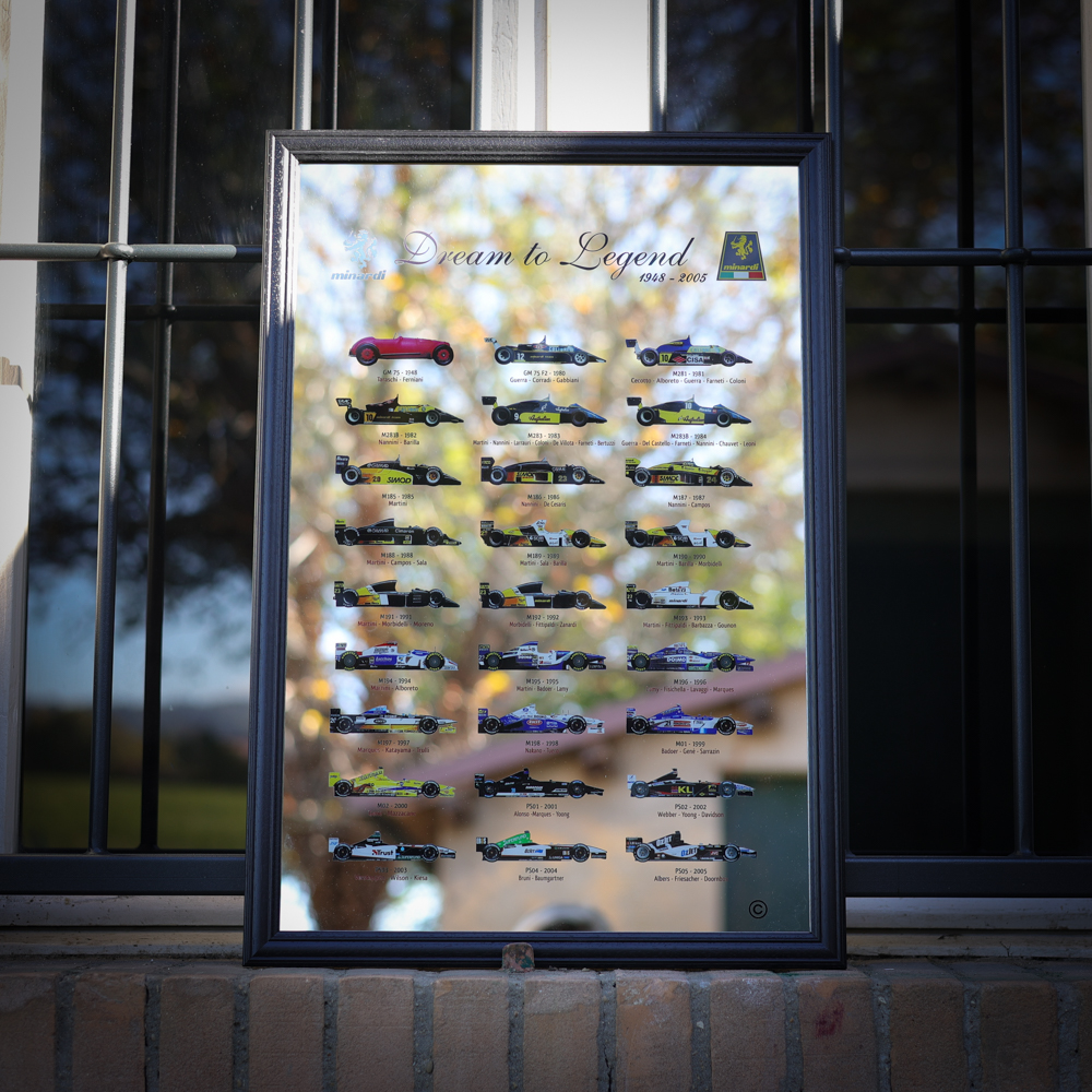 The image depicts a framed mirror titled “Dream to Legend” featuring various racing cars from the Minardi team, spanning the years 1985 to 2005.